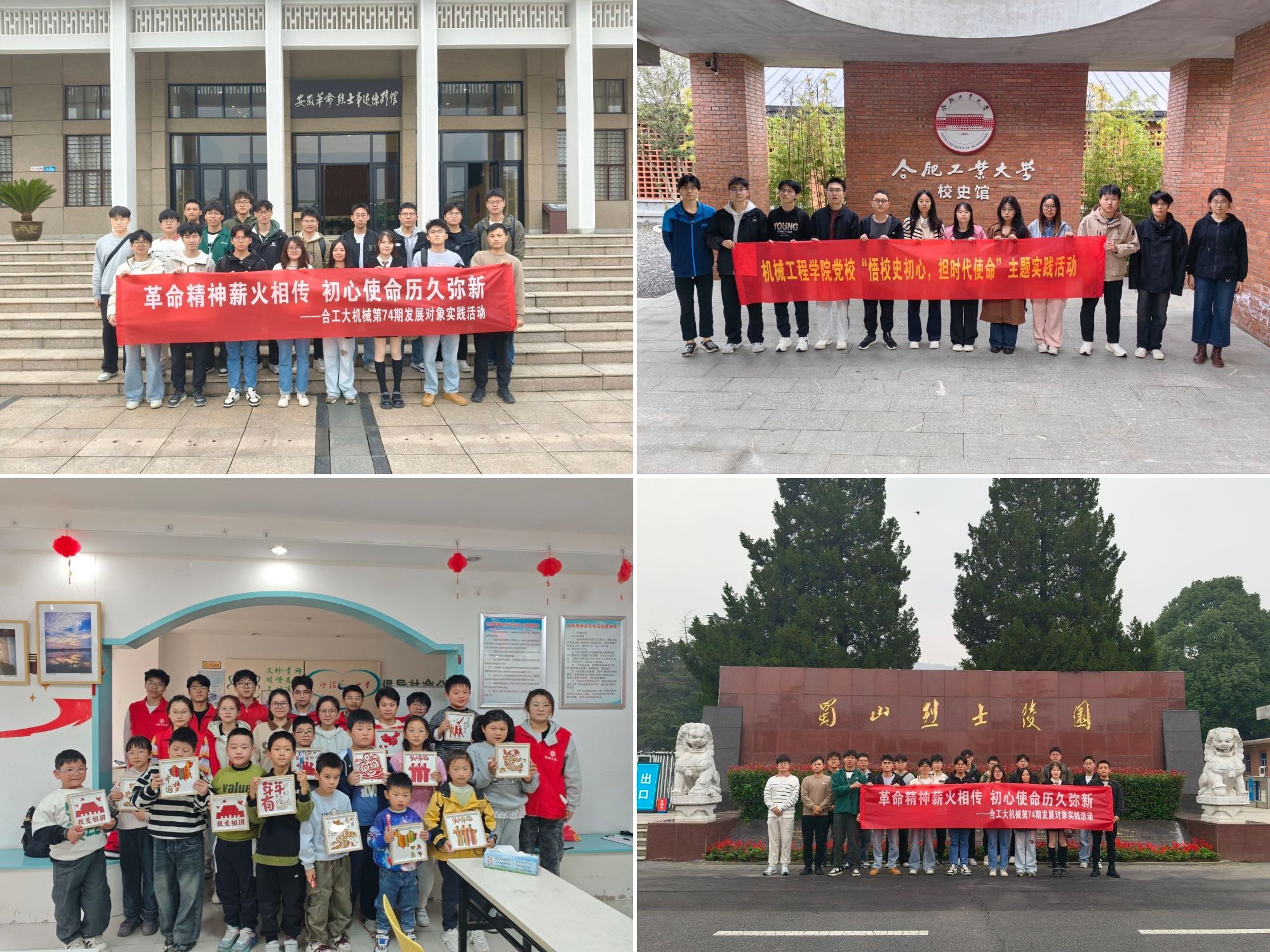 研究生学员前往蜀山烈士陵园,开展“革命精神薪火相传,初心使命历久弥新”红色教育实践,大家瞻仰了庄严的江淮烈士纪念碑,参观了安徽革命烈士事迹纪念馆,在肃穆氛围中重温那段波澜壮阔的峥嵘岁月,接受了一次深刻的思想洗礼。2022级和2023级本科生学员以“悟校史初心,担时代使命”为主题,走进校史馆,回顾学校发展历程中的奋斗足迹,深刻体悟办学初心与育人使命,进一步激发了传承校史精神、投身时代建设的热情与决心。2024级本科生学员走进社区,开展“祖国旗帜在我心,红色竹编践初心”专项志愿服务,为社区小朋友讲解国旗的设计理念、红色寓意及背后的感人故事;在创意手工环节,协助孩子们制作红色竹编画,以“大手拉小手”的形式,让红色基因浸润童心、代代相传。